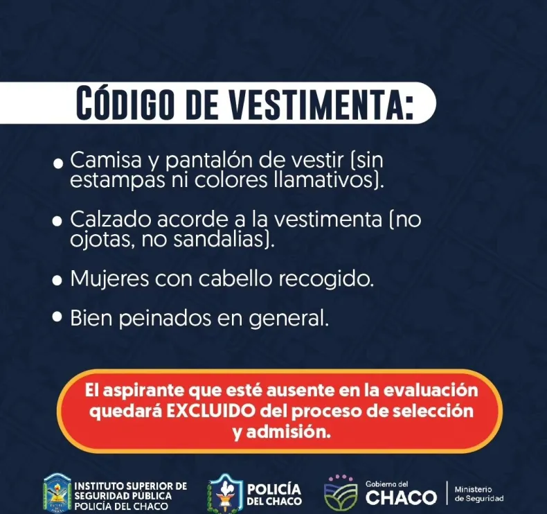 Desde la Policía informaron además que: "El aspirante que esté ausente en la evaluación quedará EXCLUIDO del proceso de selección y admisión".