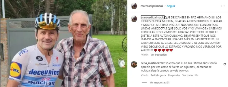 En la misma sintonía, Marcos Di Palma publicó: "Que descanses en paz hermano!!!!!! los ídolos nunca mueren, gracias a Dios pudimos charlar y mucho la última vez que nos vimos!!!! contar esas lindas anécdotas que solo vos y yo vivimos y sabemos cómo las resolvimos!!!!!! gracias por todo lo que le distes a este automovilismo. siempre sentí que nos íbamos a encontrar una vez más en las pistas!!!!!! un gran abrazo al cielo, seguramente ya estarás con mi viejo decile que lo extraño y pronto nos veremos por ahí!".
