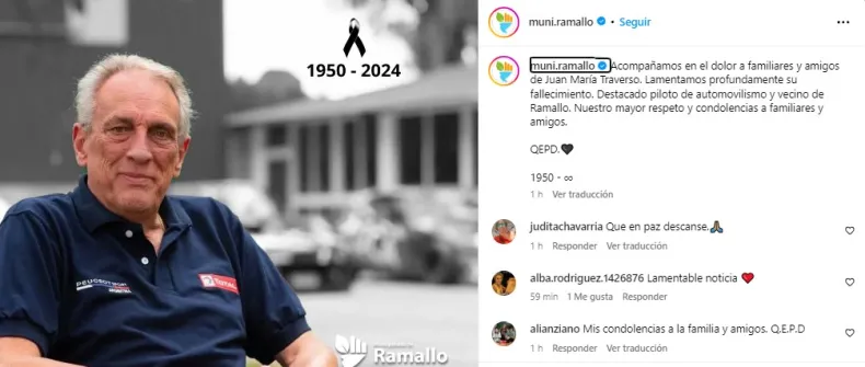 En primera medida, desde el Municipio de Ramallo postearon: "Acompañamos en el dolor a familiares y amigos de Juan María Traverso. Lamentamos profundamente su fallecimiento. Destacado piloto de automovilismo y vecino de Ramallo. Nuestro mayor respeto y condolencias a familiares y amigos".