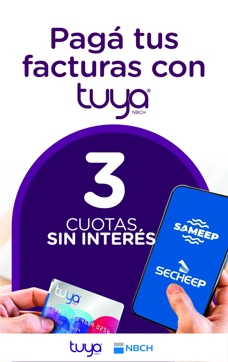 Nuevo Banco del Chaco recuerda las opciones de pago y financiamiento disponibles para abonar las boletas de agua y de luz en 3 cuotas sin interés con tarjeta Tuya, a través de las plataformas digitales y en las oficinas presenciales de Sameep y Secheep.