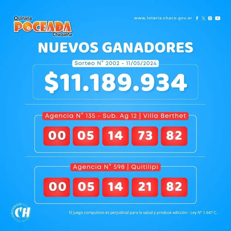 Se trató del sorteo número 2002 de la Poceada Chaqueña del día sábado 11 de mayo y en esta ocasión los ganadores recibieron un total de $ 5.594.967 cada uno.