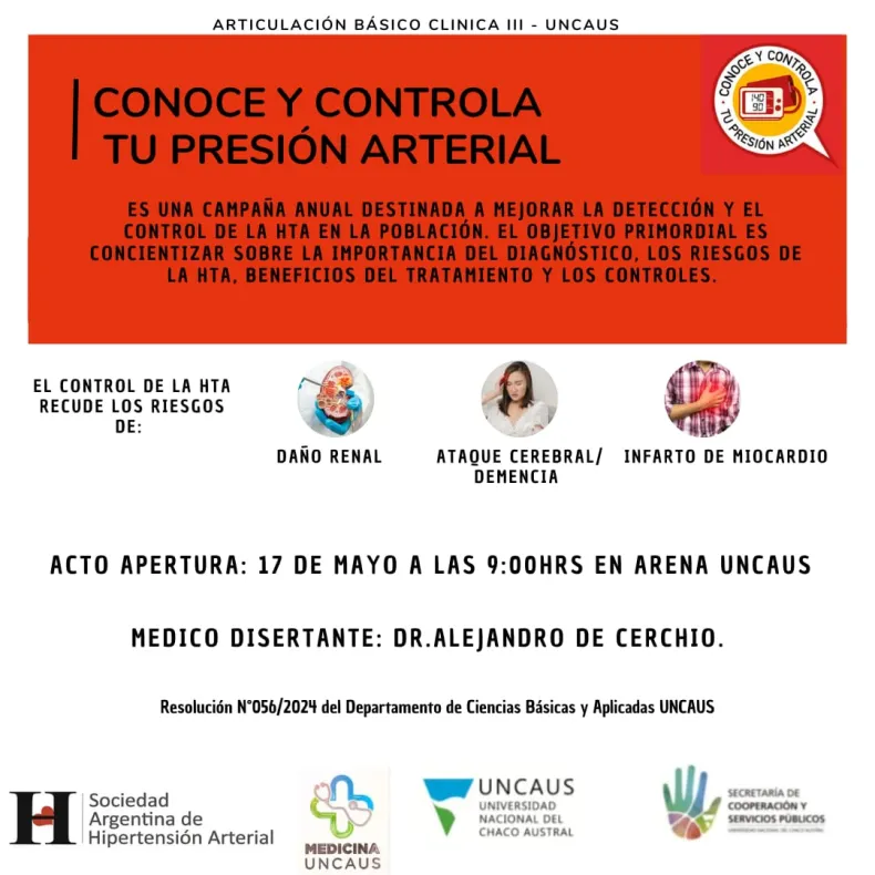 La Universidad Nacional del Chaco Austral, desde la Secretaría de Cooperación y Servicios Públicos, invita a la ciudadanía a participar de la "Campaña: controla y conoce tu presión arterial 2024" y "El parto es respetado cuando vos podés elegir", que se desarrollarán en la institución educativa el día viernes 17 de mayo, desde las 8 horas.
