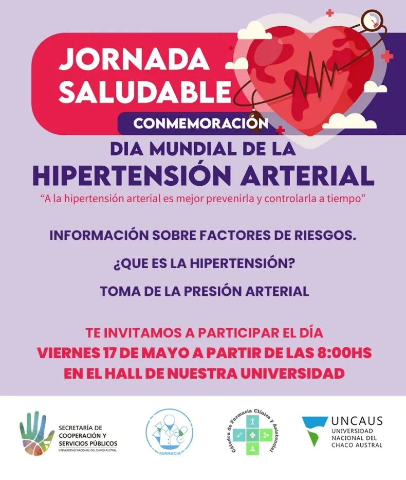En conmemoración al día Mundial de la Hipertensión Arterial, estudiantes de la carrera de Farmacia brindarán información sobre este tema, factores de riesgo y toma de presión arterial, a partir de las 8 horas, en el hall de entrada de la Universidad.