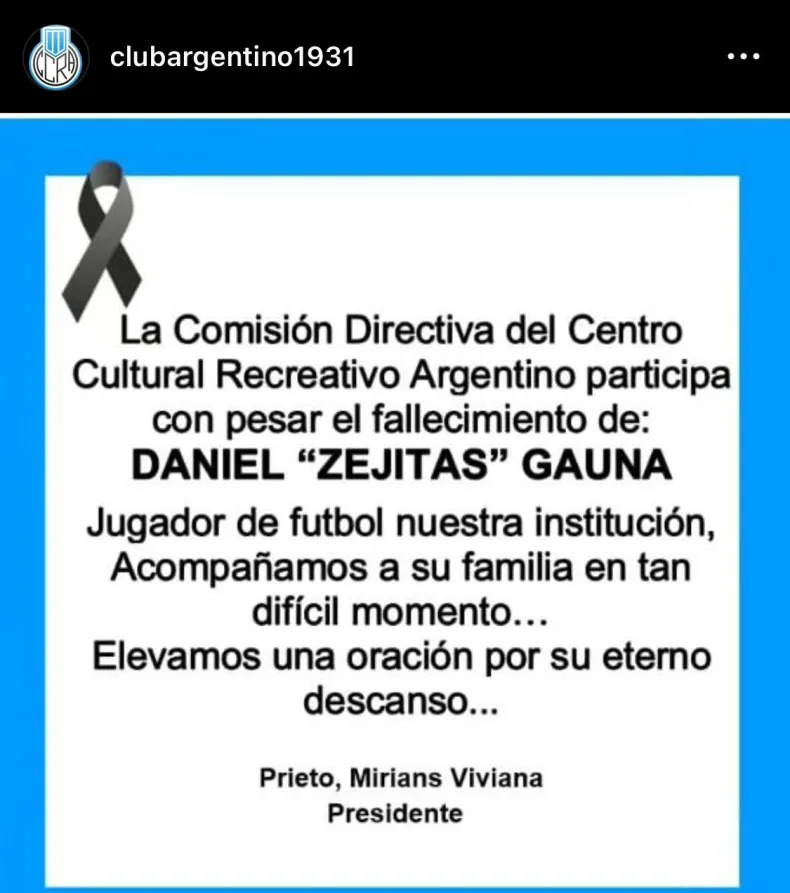 Además, la Comisión Directiva del Centro Cultural Recreativo Argentino, donde Daniel jugaba al fútbol, emitió un breve pero sentido comunicado: "Lamentamos el fallecimiento de Daniel ‘Zejitas’ Gauna, jugador de fútbol de nuestra institución. Acompañamos a su familia en tan difícil momento y elevamos una oración por su eterno descanso".