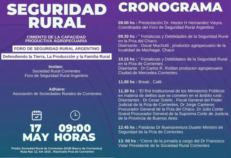 Además, en la jornada se presentaron Héctor Hernández Vieyra coordinador del foro, Oscar Muchutti, productor agropecuario de la localidad de Machagai, Carlos Roldan, productor agropecuario de la localidad de Mercedes (Corrientes). Y cerrarán con la participación del doctor Buenaventura Duarte, ministro de Seguridad de Corrientes y Francisco Velar, presidente de la Sociedad Rural de Corrientes.