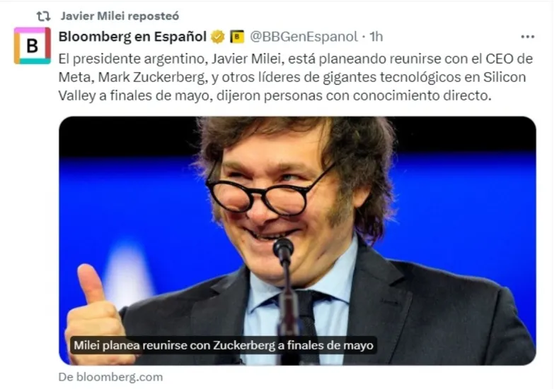 Si bien el Presidente se encuentra de visita en Madrid, ya planea reunirse con Mark Zuckerberg y otros líderes de gigantes tecnológicos en Silicon Valley a finales de mayo. La información fue publicada por la agencia Bloomberg y replicada por el mismo jefe de Estado vía X. Este sería su viaje en poco más de cinco meses de gestión.