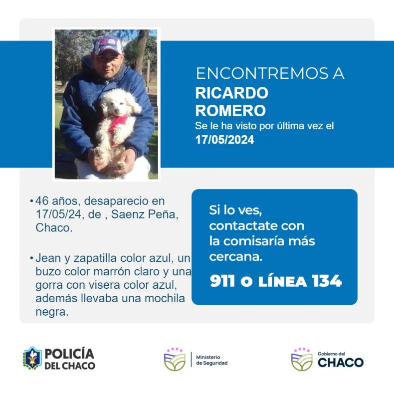 La Policía del Chaco en base a una denuncia registrada en Comisaria Tercera Sáenz Peña, solicita a la comunidad su valiosa colaboración de informar a la unidad policial más cercana cualquier información relacionada al paradero de Ricardo Romero.