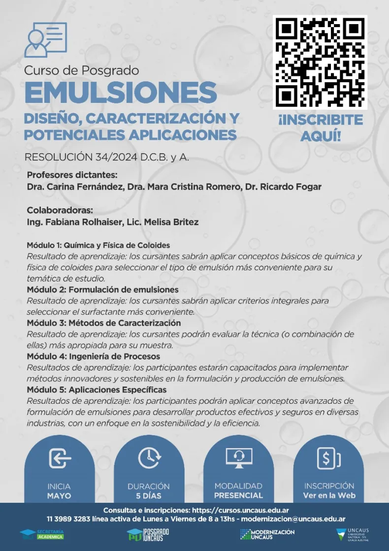 El 27 de mayo comienza esta nueva propuesta académica, que se desarrollará con modalidad presencial durante cinco días. Se dictará bajo Resolución Nº 34/2024- D.C.B.y A., con los siguientes contenidos: química y física de coloides; formulación de emulsiones; métodos de caracterización; ingeniería de procesos; aplicaciones específicas.
