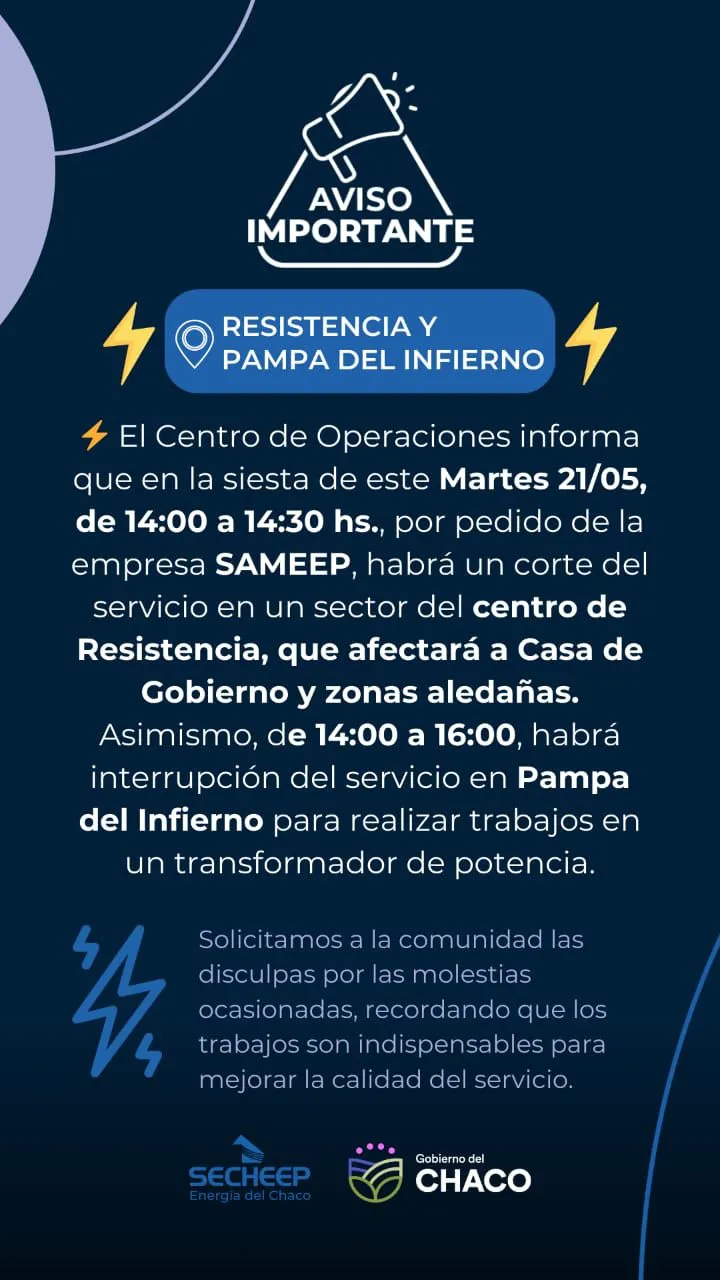 A través de un aviso en sus redes sociales desde SECHEEP comunicaron que "el centro de Operaciones informa que en la siesta de este martes 21/05 de 14 a 14.30 horas, por pedido de la empresa SAMEEP, habrá un corte del servicio en un sector del centro de Resistencia, que afectará a Casa de Gobierno y zonas aledañas".