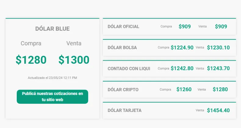 En cuánto a las demás cotizaciones el dólar bolsa se encuentra en $ 1217.20 para la compra y $ 1220.50 para la venta, el contado con liqui $ 1236.90 para la compra y $ 1238.40 para la venta, el dólar cripto en $ 1248 para la compra y $ 1266 y para la venta y el dólar tarjeta $ 1454.4 para la venta.