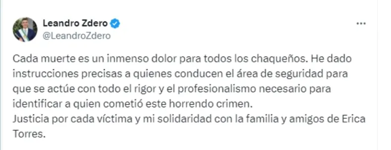 "Cada muerte es un inmenso dolor para todos los chaqueños . He dado instrucciones precisas a quienes conducen el área de seguridad para que se actúe con todo el rigor y el profesionalismo necesario para identificar a quien cometió este horrendo crimen", publicó el mandatario provincial en sus redes sociales.
