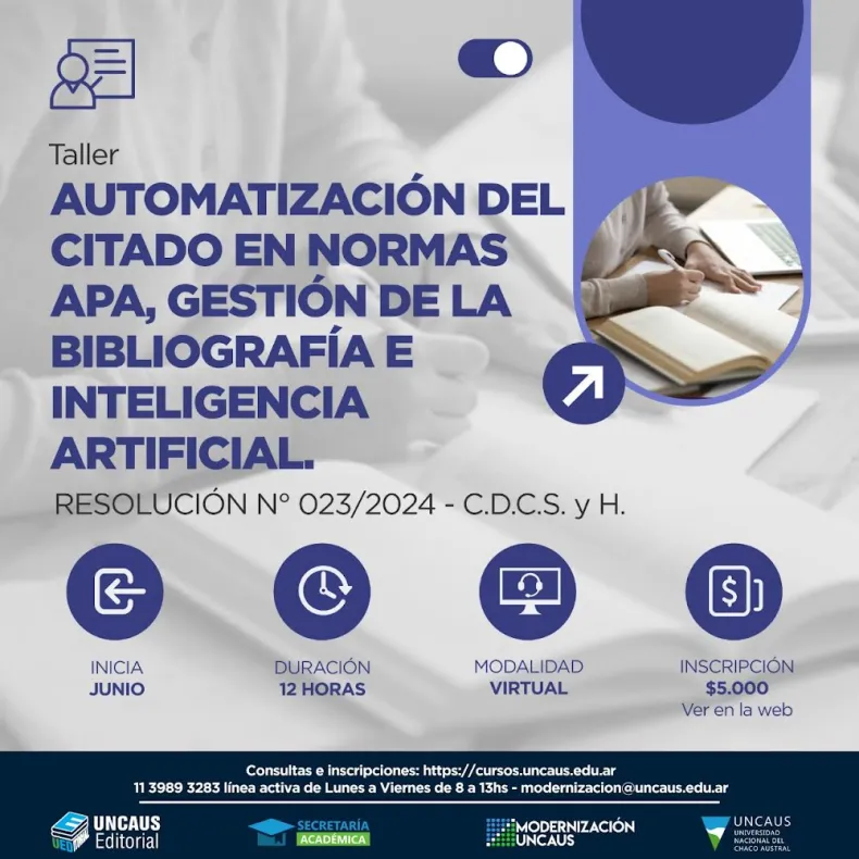 La Universidad Nacional del Chaco Austral (UNCAUS) abrió inscripciones para el nuevo Taller "Automatización del citado en Normas APA", que comenzará el 13 de junio de 2024 con modalidad virtual y se dictará los días jueves de 17 horas a 19 horas.