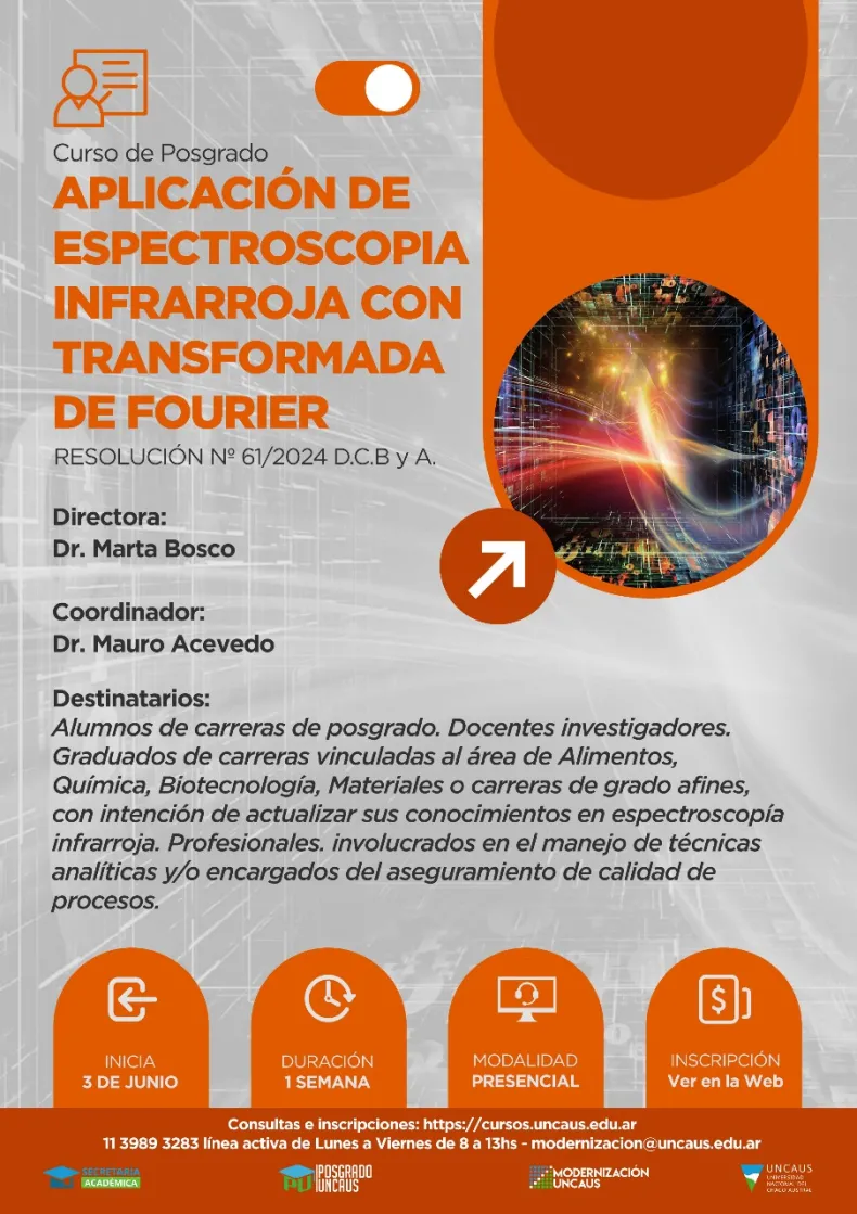 Está aprobado por Resolución Nº 61/2024- D.C.B. y A. y es destinado a alumnos de carreras de posgrado; docentes investigadores; graduados de carreras vinculadas a áreas de alimentos, química, biotecnología, materiales o carreras de grado afines, con intención de actualizar sus conocimientos en espectroscopía infrarroja; profesionales involucrados en el manejo de técnicas analíticas y/o encargados del aseguramiento de calidad de procesos.
