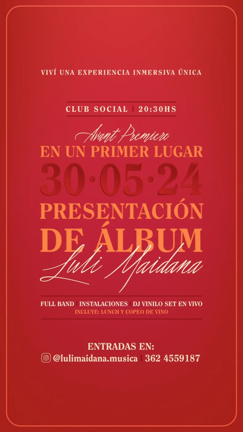 La Avant Premiere del esperado lanzamiento del primer álbum de estudio de la cantautora chaqueña Luli Maidananos ofrece una exclusiva mirada al interior de su obra, invitando a los espectadores a sumergirse en su universo musical. Este evento promete ser único e innovador, propone una experiencia inmersiva donde los sonidos cobran vida, una obra para recorrer, donde la música se convierte en una sinfonía de colores, texturas y aromas.