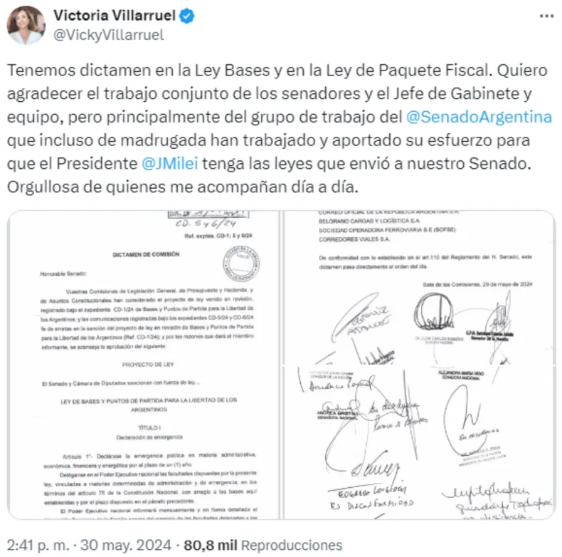 "Tenemos dictamen en la ley Bases y en la Ley de Paquete Fiscal. Quiero agradecer el trabajo conjunto de los senadores y el Jefe de Gabinete y equipo, pero principalmente del grupo de trabajo del Senado, que incluso de madrugada han trabajado y aportado su esfuerzo para que el Presidente Javier Milei tenga las leyes que envió a nuestro Senado. Orgullosa de quienes me acompañan día a día", publicó Villarruel en su cuenta personal de X.