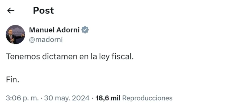 Por su parte, el vocero presidencial, Manuel Adorni también apoyó el dictamen realizando un publicación por medio de su cuenta personal de X, donde expresó: "Tenemos el dictamen en la ley fiscal. Fin.".
