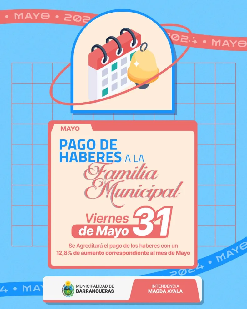 Este viernes 31 de mayo se acreditará el pago de haberes con un 12,8% de aumento correspondiente al mes de mayo a todos los empleados municipales de Barranqueras.