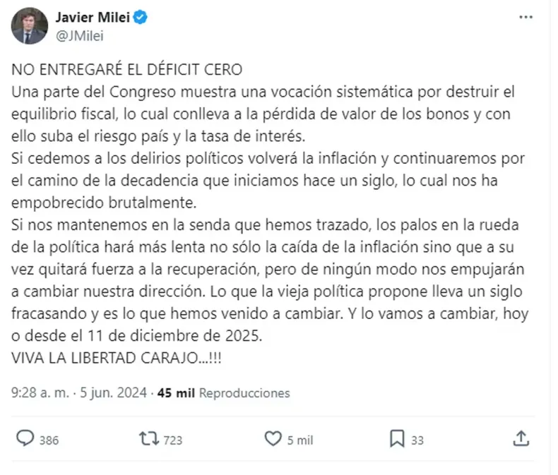 En sus redes sociales, Milei reiteró su postura de no comprometer el equilibrio fiscal y advirtió que utilizará su poder de veto si es necesario. En su mensaje, hizo hincapié en la importancia de mantener la senda de reformas para evitar una caída en la inflación y promover el crecimiento económico.