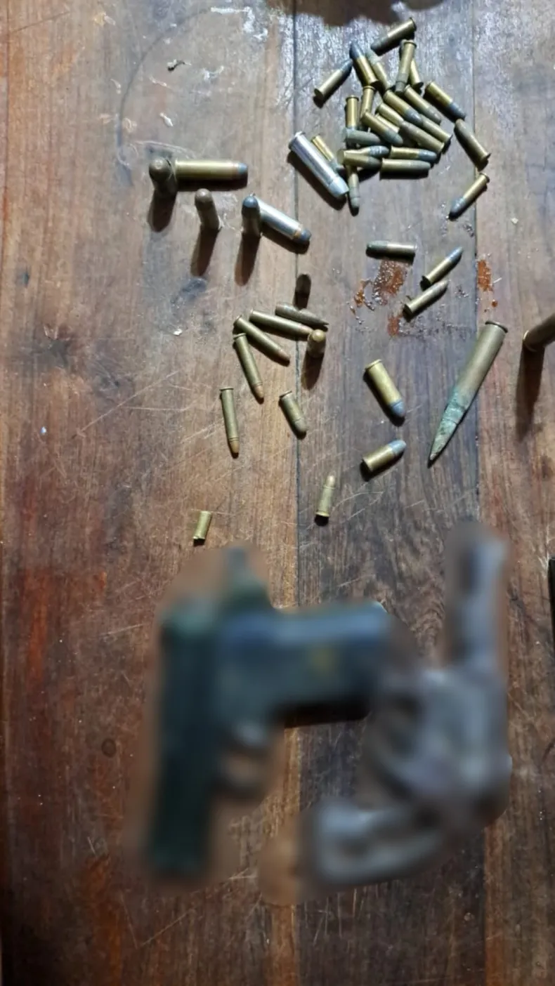 Al requisar el lugar, hallaron una pistola calibre 22mm., un revolver calibre 22mm, 47 cartuchos de distintos calibres, más de 100 gramos de cocaína, entre otros elementos.