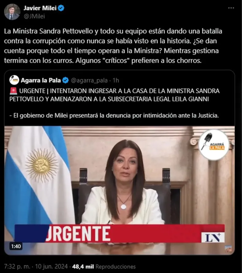 Tras darse a conocer la noticia, el presidente Javier Milei respaldó a la funcionaria con una publicación en su cuenta de X: "La ministra Sandra Pettovello y todo su equipo están dando una batalla contra la corrupción como nunca se había visto en la historia. ¿Se dan cuenta por qué todo el tiempo operan a la Ministra? Mientras gestiona termina con los curros. Algunos ‘críticos’ prefieren a los chorros".