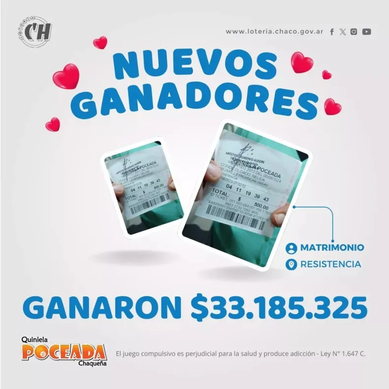 Esta combinación manual, registrada en la Agencia 342 de Nélida Conde Olgado, le permitió a esta familia resistenciana alzarse con un premio total de 33.185.325 pesos, correspondiente al sorteo de la Poceada del pasado 6 de junio.