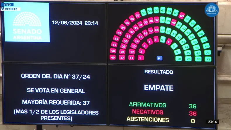 El Senado aprobó de forma general el proyecto de la Ley Bases. Fue por 36 votos positivos contra 36 negativos, en el que la vicepresidente Victoria Villarruel desempató y votó a favor de la ley. Ahora, seguirá la votación en particular por títulos.