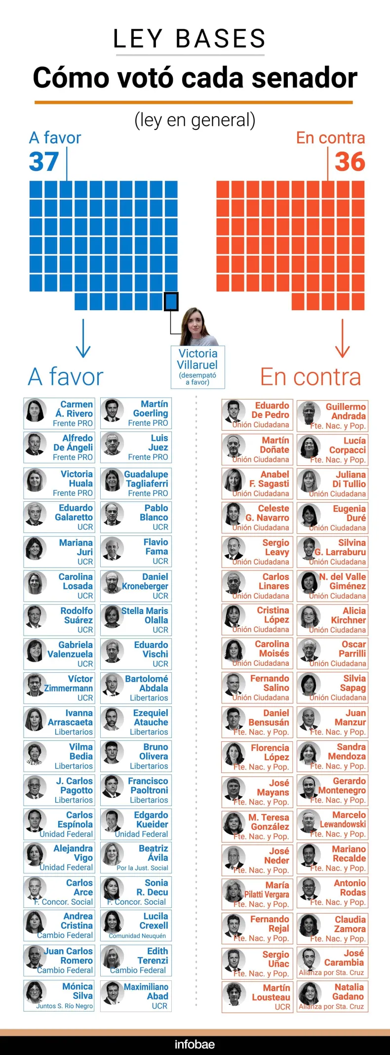 Por su parte, los senadores libertarios que votaron de manera afirmativa son: Bartolomé Abdala, Ivanna Arrascaeta, Ezequiel Atauche, Vilma Bedia, Bruno Olivera, K.Carlos Pagotto, y Francisco Paoltroni. Mientras que de Unión Federal, los senadores Carlos Espíndola, Edgardo Kueider y Alejandra Vigo.
