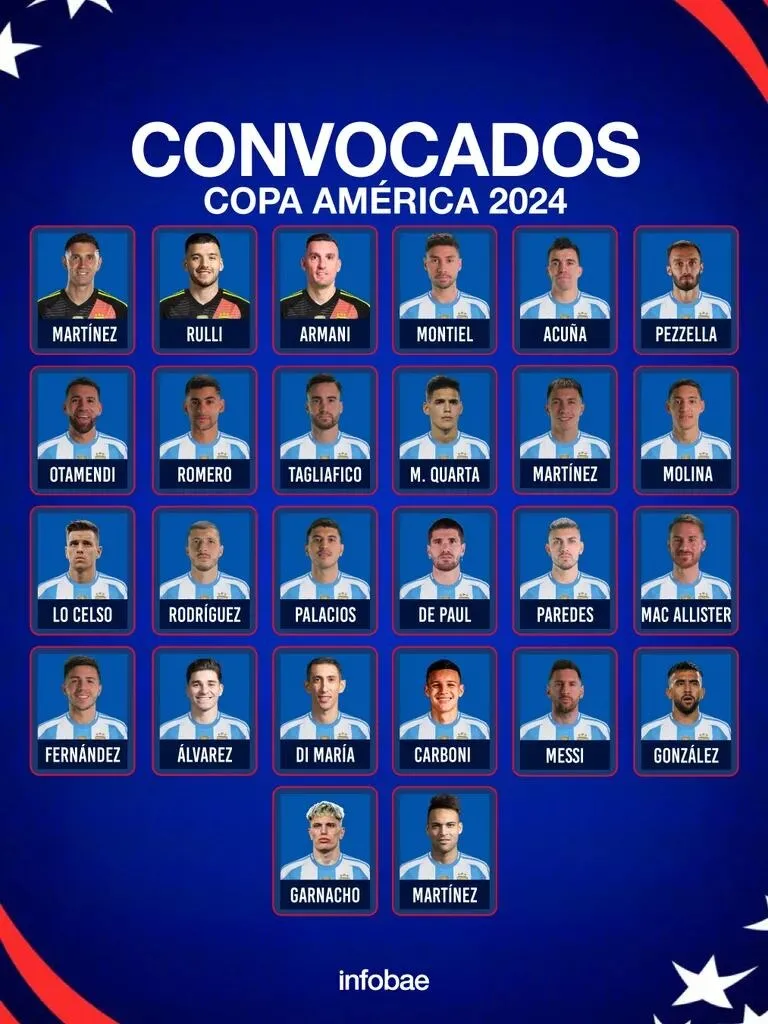 Lionel Scaloni finalizó la lista de 26 jugadores que representarán a Argentina en la Copa América 2024 en Estados Unidos, tras excluir a tres jugadores de su preselección de 29. Los desafectados son Leonardo Balerdi, Valentín Barco y Ángel Correa.