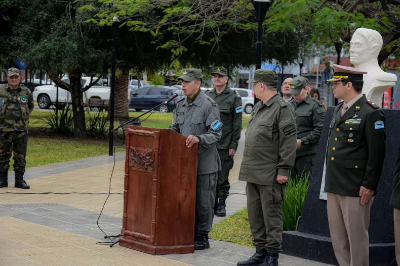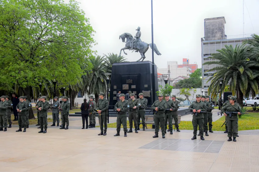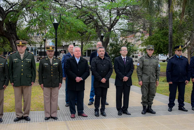 El acto tuvo lugar en el busto del general Martín Miguel de Güemes que se encuentra en plaza San Martín, y contó con la presencia del presidente del diputado nacional, Gerardo Cipolini; el secretario de Gestión y Promoción Educativa, Pedro Egea; el subsecretario de Seguridad Vial, Rafael Acuña; el Comandante General Antonio Leguizamón; jefe del Comando Región VIII de Gendarmería Nacional; el Comandante Mayor Valentín Otazo; el Comandante Principal Fabian Mielnichuk del Escuadrón 1 Roque Sáenz; Bomberos Voluntarios, Veteranos de Malvinas; autoridades de Policía Federal y diferentes Fuerzas de Seguridad y demás funcionarios municipales.