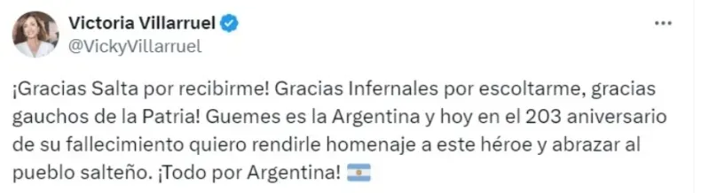 En su cuenta de X, Villarruel expresó: "¡Gracias Salta por recibirme! Gracias Infernales por escoltarme, gracias gauchos de la Patria! Güemes es la Argentina y hoy, en el 203 aniversario de su fallecimiento, quiero rendirle homenaje a este héroe y abrazar al pueblo salteño. ¡Todo por Argentina!".