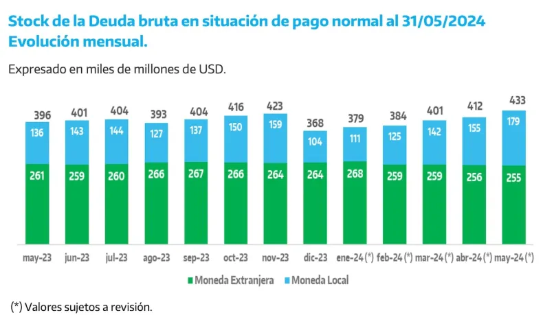La deuda pública medida en dólares alcanzó un nuevo récord en mayo y sumó US$433.000 millones. De ese total, US$179.000 millones (41% del total) corresponden a bonos en pesos y US$255.000 millones (59%) se pagarán en moneda extranjera.