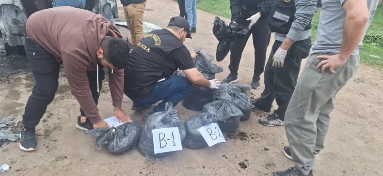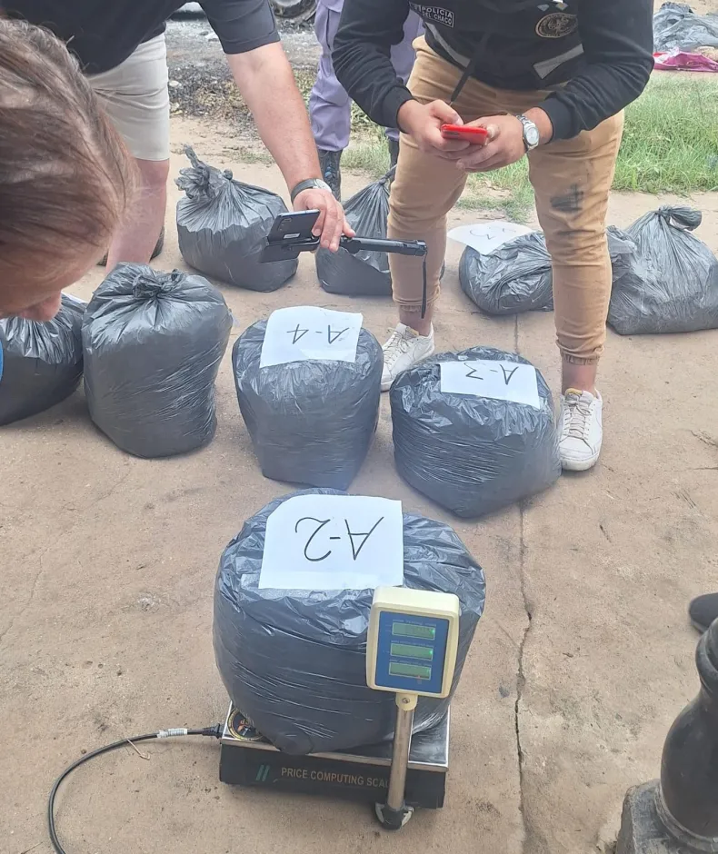 Los agentes inspeccionaron el vehículo y recolectaron la sustancia. En total, se contabilizó 75,780 kilos de marihuana distribuidos en catorce bolsas plásticas. El pesaje detallado arrojó 29,650 kilos en la calle que estaban mojados debido a la intervención de los bomberos y 46,130 kilos en el baúl del automóvil.