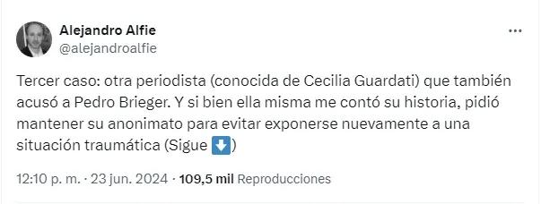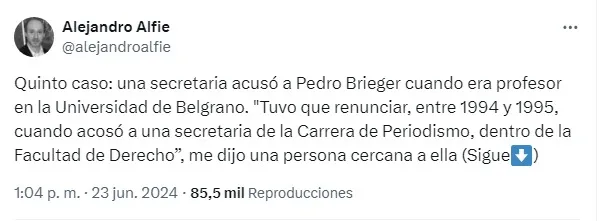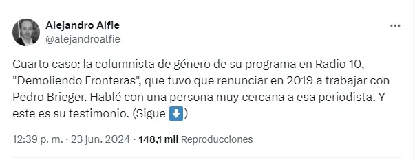 Escribe Alfie en su cuenta de X: "Cuarto caso: la columnista de género de su programa en Radio 10, "Demoliendo Fronteras", que tuvo que renunciar en 2019 a trabajar con Pedro Brieger. Hablé con una persona muy cercana a esa periodista. Y este es su testimonio. Ella tuvo situaciones de mucha incomodidad en el programa de Brieger. Imagínate que la columnista iba a hablar de género y feminismo, pero él la acosaba todo el tiempo, le decía "qué linda que sos" y más cosas, le mandaba mensajes de WhatsApp totalmente desubicados ...donde el límite estaba totalmente borroso. Al aire él era un conductor deconstruido, que la trataba con mucho respeto. Pero cuando el programa no estaba al aire era un personaje acosador, que todo el tiempo tenía actitudes fuera de lugar con su colega, pese... ...pese a que ella no le daba pie para que él insistiera", contó una persona muy cercana a la periodista. Y agregó: "Fue una situación tan difícil, de mucha tensión, que, pese a que ella quería seguir trabajando ahí, porque era joven y estaba en un programa de radio... pero a los seis meses tuvo que renunciar, por el lugar que él tenía en el medio, un lugar de poder, ya que era el conductor de su programa de radio", agregó. Y destacó que, al principio, la periodista de Radio 10 "no entendía si era un problema suyo, para ponerle los límites a Brieger. Pero sintió que así no podía seguir trabajando y renunció". "Después conoció situaciones similares y mucho más graves... y ahí pudo entender que le habían pasado situaciones de acoso en su ámbito laboral, aunque no fueron hechos tan concretos como en otros casos", concluyó la persona muy cercana a esa periodista, en diálogo conmigo.