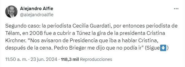 Escribe Alfie: "La periodista Cecilia Guardati, por entonces periodista de Télam, en 2008 fue a cubrir a Túnez la gira de la presidenta Cristina Kirchner. "Nos avisaron de Presidencia que iba a hablar Cristina, después de la cena. Pedro Brieger me dijo que (él) no podía ir. Y me pidió que le pase el audio cuando volviera de ese encuentro. Como colega, yo no tenía ningún problema", me dijo Guardati. "Al volver de la conferencia con Cristina Kirchner, recibo otro mensaje de Brieger, pidiéndome si podía llevarle el audio a su habitación y contarle qué había dicho Cristina en esa reunión. En este tipo de viajes, la habitación se transforma en una oficina, así que jamás me imaginé lo que iba a pasar después ahí", continuó la periodista. Y agregó: "Al llegar a su habitación, veo que tenía la puerta entreabierta. Entonces, ingresé y me lo encuentro a Brieger desnudo, recostado sobre el respaldo de la cama, hablándome y tapándose con una sábana, masturbándose mientras me hablaba". Y continuó Guardati: "Yo me fui inmediatamente y nunca más le volví a hablar. Imaginate que lo habían enviado a cubrir la gira de Cristina Kirchner, para la TV Pública, y él hacía esto". Guardati destacó que posteriormente Brieger iba a participar de una charla en Télam, "pero su invitación fue cancelada" cuando sus colegas tomaron conocimiento de la situación que contó la periodista en su cobertura periodística en Túnez. ¿Por qué no hizo la denuncia judicial?, le pregunté. Y Guardati me dijo: "Cuando pasó esto no dije nada, hasta tiempo después, cuando comenté el caso con mis amigas, cuando surgía el tema del acoso, sin tomar conciencia que esto se podía denunciar". Y agregó: "Más adelante, cuando lo denuncié en Télam, me comentaba mi entorno de colegas que era un periodista del poder, que tenía vínculos políticos, ¿para qué meterme en esa situación viviendo afuera?", porque estaba en España. "Y diría que por miedo a que te cuestionen, que me iban aponer en foco y yo no quería ser foco de nada. Después lo hablé con una amiga abogada y me dijo que tenía que conseguir otros casos, para mostrar que había un patrón de comportamiento, que no era un solo caso, dijo Guardati. "ya que en la medida que hubiera varias denuncias, había un patrón de comportamiento para poder denunciarlo ante la Justicia", concluyó la periodista su testimonio.