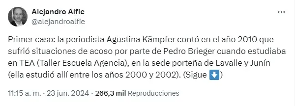 Escribe Alfie: "La periodista Agustina Kämpfer contó en el año 2010 que sufrió situaciones de acoso por parte de Pedro Brieger cuando estudiaba en TEA (Taller Escuela Agencia), en la sede porteña de Lavalle y Junín (ella estudió allí entre los años 2000 y 2002). Lo reveló en el programa de TV en el que en ese momento trabajaba como panelista. Lo dijo sin contar que se trataba de Brieger, pero lo dijo al aire en coincidencia con el premio Martín Fierro que le dieron a él, por su trabajo en el noticiero Visión 7, de la TV Pública. Dijo que a veces llegaba tarde a clase y solo le quedaba la opción de sentarse en la primera fila, ocasión en que el profesor le miraba "la entrepierna y los pechos" de manera insistente, cosa que naturalmente la ponía muy incómoda. También dijo que la había tomado del brazo en las instalaciones de la escuela de periodismo para decirle al oído cosas tales como "qué linda que estás", o "qué bien que te queda lo que tenés puesto". Una persona muy cercana a Kämpfer me dijo: "Imaginate en el año 2010, hace 14 años, ni por asomo el feminismo tenía lugar en los medios ni en la sociedad en general. Y agregó: "También es importante que te aclare esto: en esa época salió un artículo que enmarcaba el caso como abuso sexual, quizás por la propia falta de terminología de la época. Lo correcto sería hablar de acoso sexual, porque no fue abusada". Además, añadió: "Esto a ella la angustió mucho y jamás quiso profundizar, sobre todo porque tanto los dichos completamente inapropiados, las actitudes como las miradas obscenas no tomaban relevancia en aquella época, por más daño emocional que pudieran causar". Agustina Kämpfer, sin embargo, decidió no hacer ninguna denuncia judicial contra Brieger. Esa es una constante, que se verifica también en los otros cuatro casos que pude reconstruir.