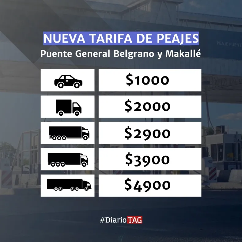 Las nuevas tarifas para vehículos se desglosan de la siguiente manera para el peaje Puente General Belgrano y el de Makallé: