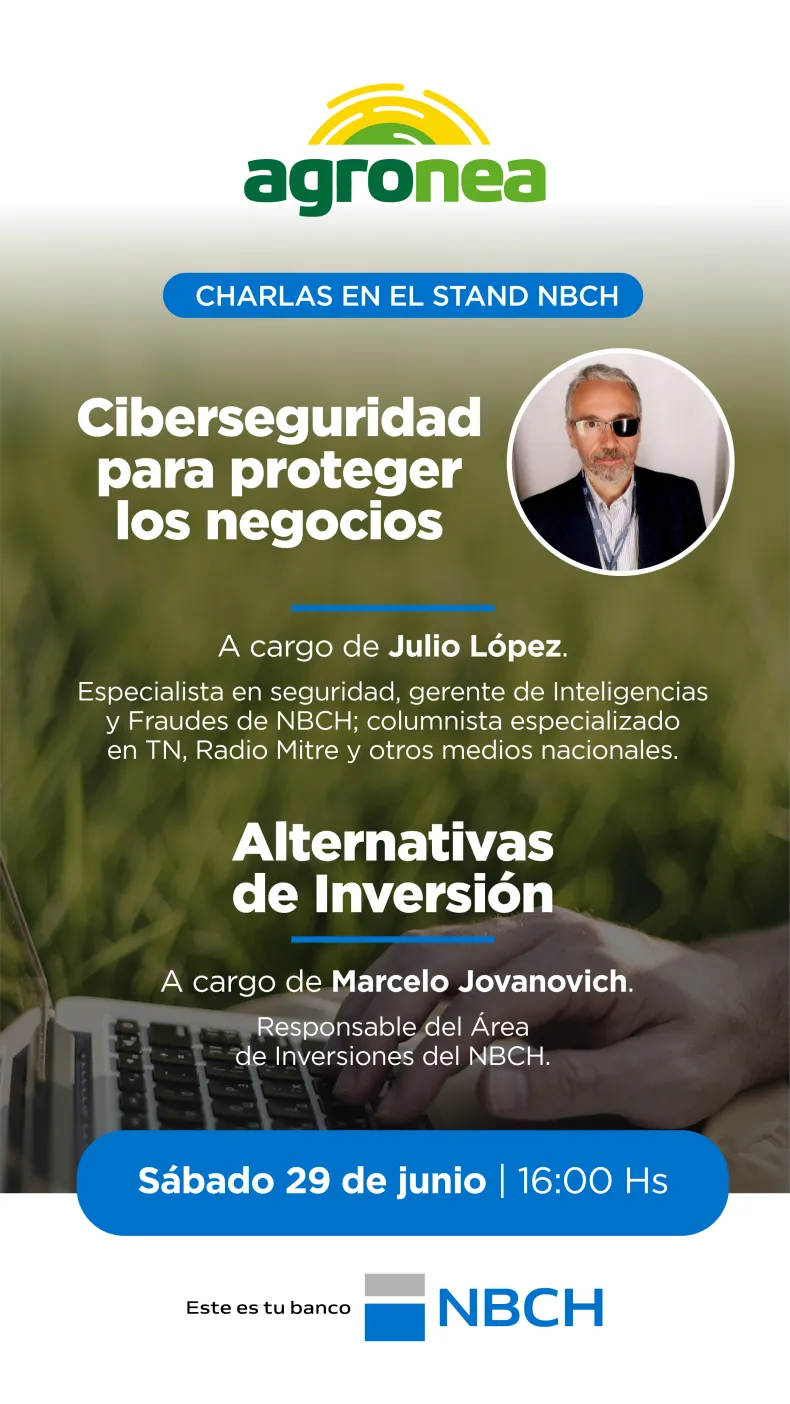 En el marco de Agronea 2024, NBCH ofrecerá dos charlas abiertas a todo público el sábado 29, a las 16, en el stand del predio. Las charlas estarán orientadas a todas las personas que quieran conocer más sobre seguridad en la banca digital e inversiones para generar rendimientos y hacer crecer el dinero.
