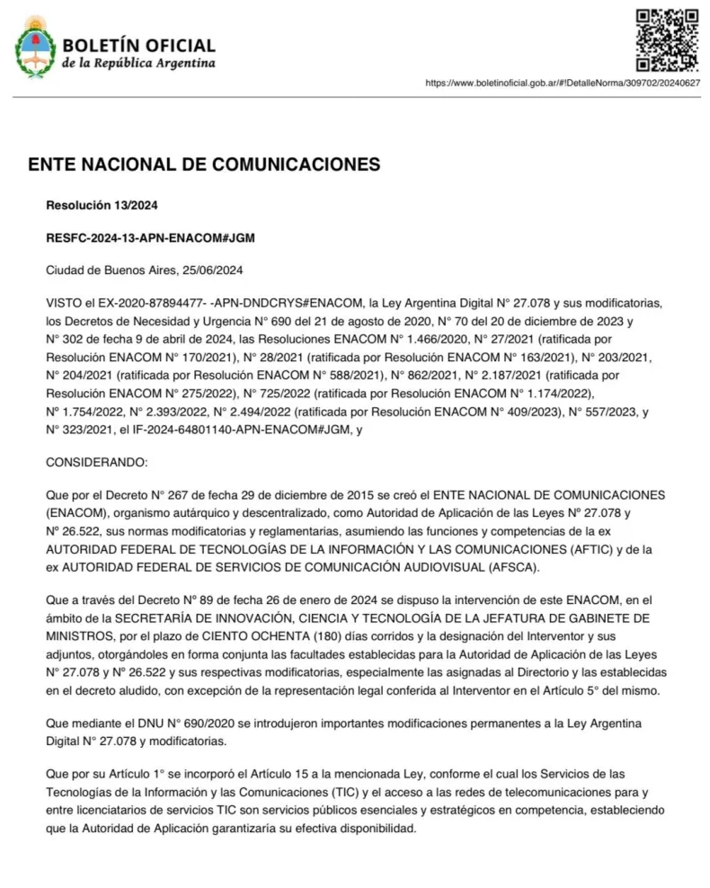 Este jueves, a través de la Resolución 13/2024 publicada en el Boletín oficial el Gobierno desreguló el mercado de Internet, celulares y cable. De esta manera, los interventores del Ente Nacional de Telecomunicaciones (Enacom), eliminaron todas las regulaciones que le ponían tope a las tarifas que fijaban un límite a las empresas para los aumentos del 5% y de hasta el 10% mensual.