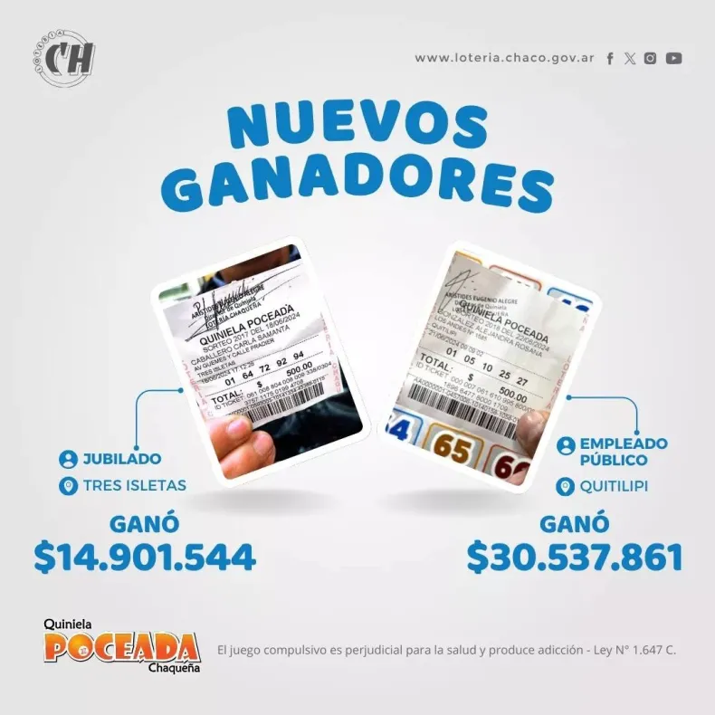 En un golpe de suerte, un jubilado de Tres Isletas y un empleado público de Quitilipi se unieron al grupo de ganadores de la Quiniela Poceada, llevándose millonarios premios tras acertar los cinco números de la combinación ganadora.