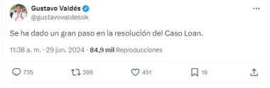 "Se ha dado un gran paso en la resolución del caso Loan", escribió el mandatario provincial. El mensaje fue corto y ahora se aguarda más información respecto a cuáles serían las nuevas novedades de el caso que estremece a todo un país.