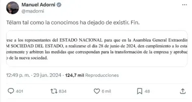 "Télam tal como la conocimos ha dejado de existir", publicó Adorni en la red social de X, junto con una imagen en donde expresa que la entidad se transformaría en una nueva sociedad del Estado Nacional.