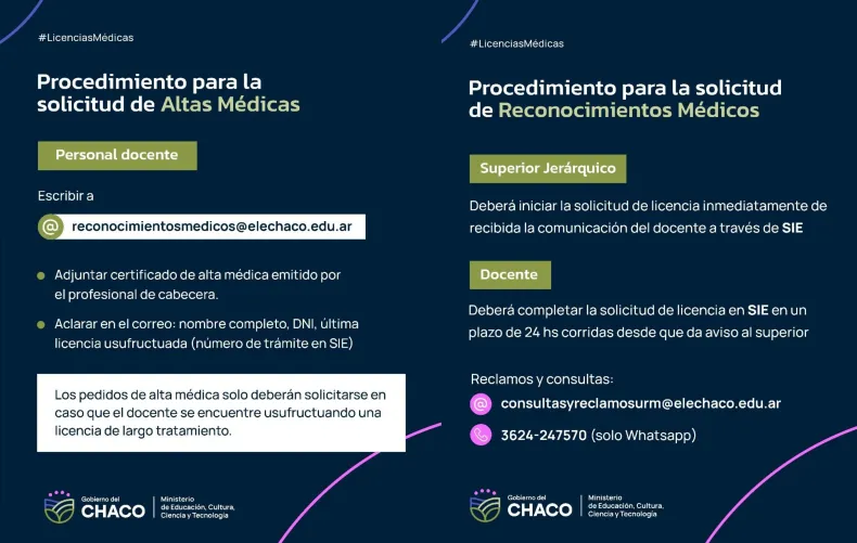 En cuanto al personal no docente, el procedimiento detallado para iniciar solicitudes de licencias y altas médicas se encuentra explicado en el video tutorial disponible en el sitio dirdocumentacion.educacion.chaco.gob.ar/2024/06/27/solicitud-licencia/.