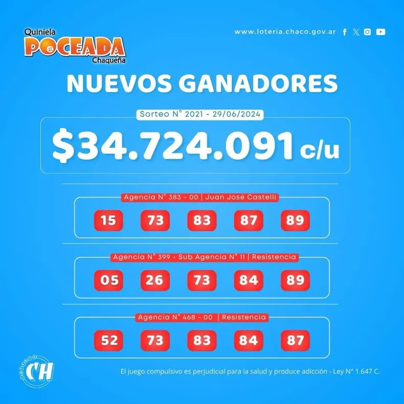 Se trató del sorteo número 2021 de la Poceada Chaqueña del sábado 29 de junio de 2024 y en esta ocasión los ganadores recibieron un total de $ 34.724.091 cada uno.