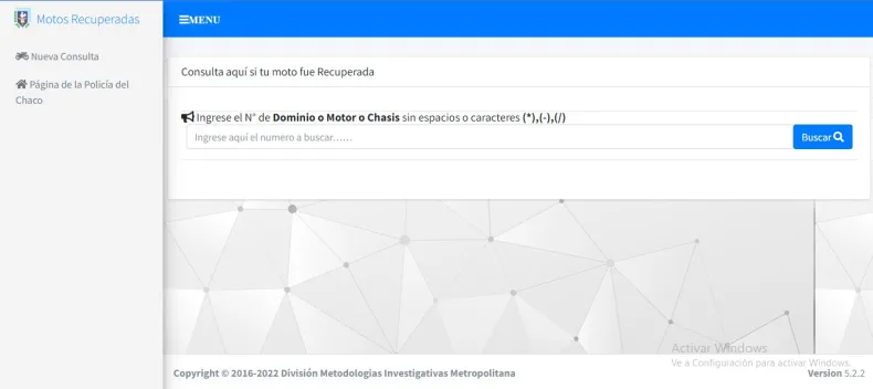 Se encuentra dentro de la web https://policia.chaco.gob.ar/#/, es un botón con la leyenda "Motos Recuperadas". Solo deben cargar número de Dominio o Motor o Chasis.