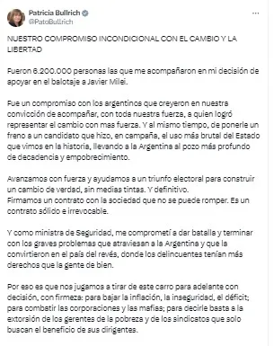 Asimismo, en una extensa publicación en X, la extitular del PRO dejó en claro que "Nuestro compromiso incondicional con el cambio y la libertad". Además, agregó: "Fue un compromiso con los argentinos que creyeron en nuestra convicción de acompañar, con toda nuestra fuerza, a quien logró representar el cambio con más fuerza. Y al mismo tiempo, de ponerle un freno a un candidato que hizo, en campaña, el uso más brutal del Estado que vimos en la historia, llevando a la Argentina al pozo más profundo de decadencia y empobrecimiento".