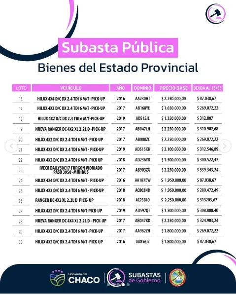 El Gobierno provincial anunció la realización de su primera subasta pública bajo esta gestión, donde se pondrán a disposición del público 30 vehículos que forman parte de los bienes del Estado Provincial.