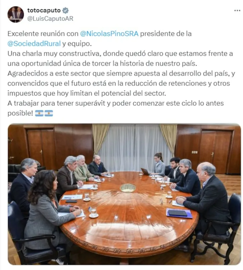 "Excelente reunión con @NicolasPinoSRA presidente de la @SociedadRural y equipo. Una charla muy constructiva, donde quedó claro que estamos frente a una oportunidad única de torcer la historia de nuestro país. Agradecidos a este sector que siempre apuesta al desarrollo del país, y convencidos que el futuro está en la reducción de retenciones y otros impuestos que hoy limitan el potencial del sector. A trabajar para tener superávit y poder comenzar este ciclo lo antes posible!", escribió el funcionario en su cuenta de X (ex Twitter).