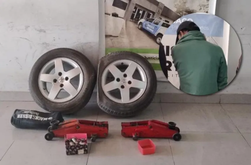 El robo ocurrió días atrás, cuando un grupo de sujetos sustrajo neumáticos con llantas, una caja de herramientas y un gato hidráulico. Tras la denuncia, durante el mediodía de este lunes, los agentes del Servicio Externo de la Comisaría 4° realizaron recorridas preventivas y, sobre pasaje Libertad al 1500, visualizaron a tres hombres con los elementos robados.