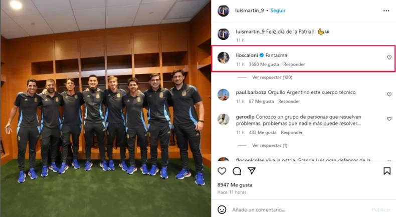 Este martes, la Selección argentina llegó una vez más a la final de la Copa América superando 2 a 0 a Canadá. Para celebrar, Luis Martín, uno de los preparadores físicos del plantel, subió un posteo en su cuenta de Instagram y recibió un polémico comentario de Lionel Scaloni.