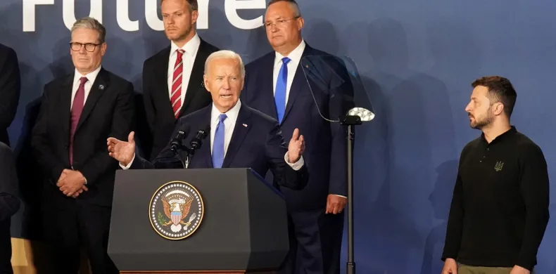 La escena ocurrió mientras los líderes de 24 países presentaban una declaración conjunta que subrayó que la seguridad de Ucrania es "integral" a la de la "región euroatlántica y más allá", y en un momento en que los medios del mundo analizan con lupa las intervenciones del mandatario estadounidense después de sus titubeos en el debate de campaña presidencial del mes pasado.